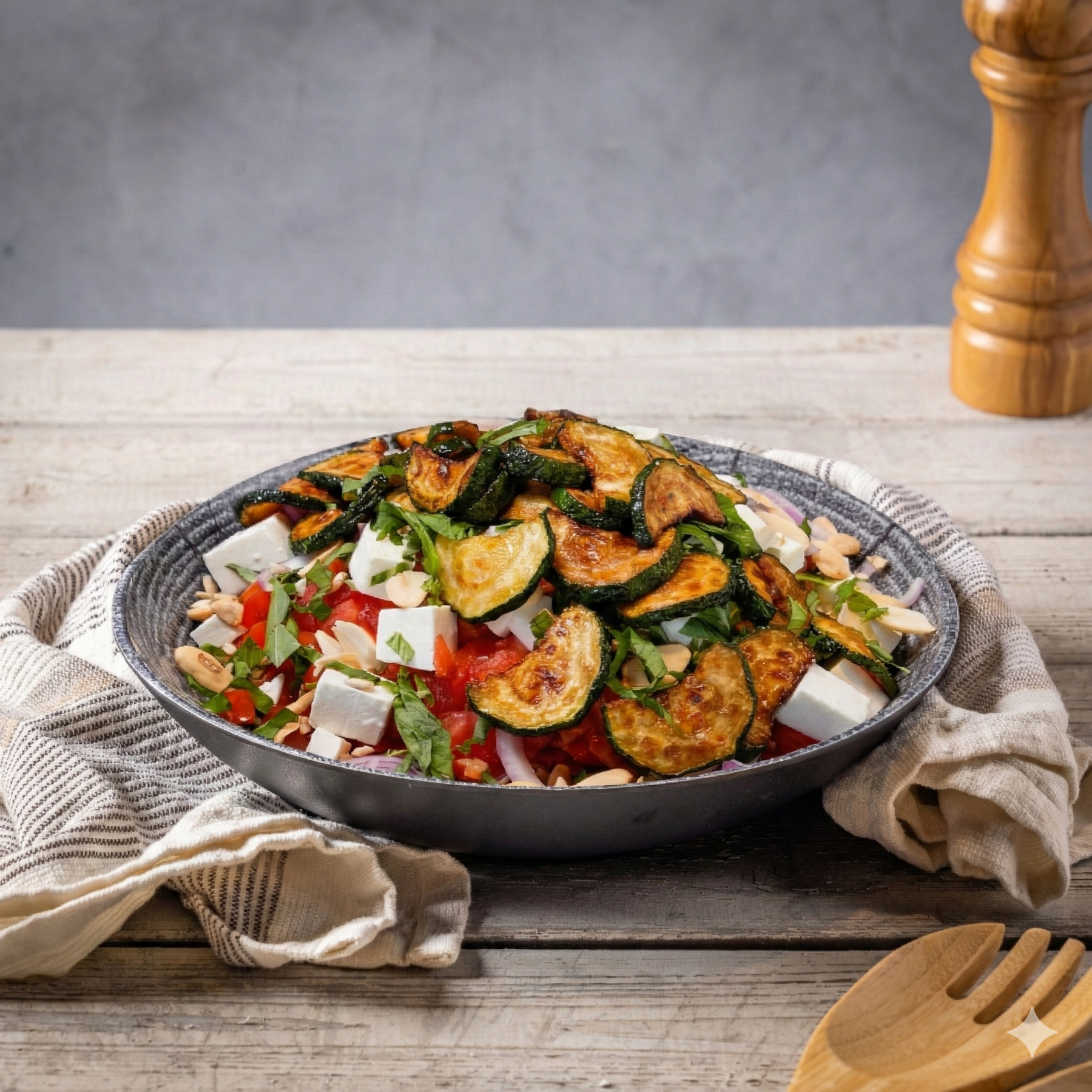 מה בסלט: עגבניות, בצל סגול, עלי בזיליקום, שקדים, בולגרית ושבבי קישוא מטוגן